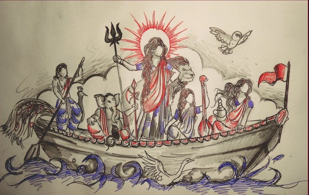 Goddess Durga arriving or leaving on a boat symbolises that she will bless you with all the resources that you need to fulfill your desires. It indicates good harvest and floods as well. It’s a good omen but not for too long. Arrival and departure on boat foretell good harvest, heavy rain and flood. Flood at first glance may seem to be a bad omen at a first but also bring fertile soil to land which ensures good harvest.