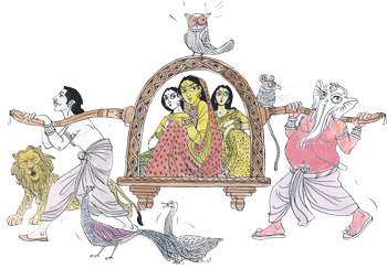 As per Hindu beliefs, Maa Durga changes her mode of transportation; besides Lion, who is her vital mount, she has four other Vahans- elephant, horse, boat, and a palanquin.