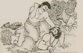 I find this piece interesting as there is a similar story in the epic Mahabharat. in Ek chakra Nagri, Vakasur used to demand large amounts of grain. He also demanded a person should be sent to him daily to satiate his hunger. When Pandavas were travelling, they reached this place and found the happenings. They decided to do something about this and surely, Bheema was sent with the cart which was sent to Vakasur daily. Soon enough, Vakasur came out and killed by Bheema.