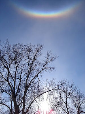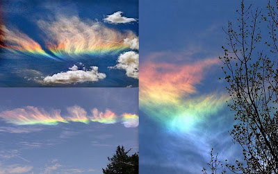 A Circumhorizontal arc, or fire rainbow, is ice-halo formed on cirrus clouds at higher altitude by ice crystals.