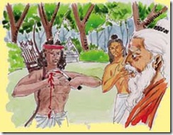 One day while Ekalavya is practicing, he hears a dog barking. Before the dog can shut up or get out of the way, Ekalavya fires seven arrows in rapid succession to fill the dog’s mouth without injuring it. Dronacharya, Pandav and Kaurav princes come to the “stuffed” dog, and wonder who could have pulled off such a feat of archery. Searching the forest, they find Ekalavya, who introduces himself to them as a pupil of Dronacharya.