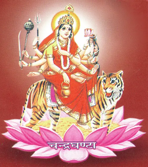 Maa Chandraghanta rides on Tiger, who is endowed with intense anger and violence and is known by this name because bell shaped mark of moon is present on her forehead. She has ten hands which hold weapons like trident, chakra, bow and arrow, paash, sword etc. Goddess Chandraghanta is the married form of Goddess Parvati. After getting married to Lord Shiva, Parvati started adorning her forehead with half Chandra (half moon).