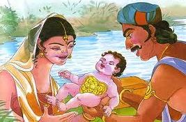 Kunti was now in the embarrassing position of being an unwed mother. Unable to face the world with her divine child, she placed Karna in a basket and floated him down a river with his jewelry, praying fervently that he would be kept safe.