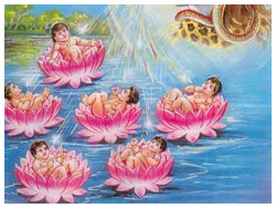 The penance of Parvathi and the sacrifice of Kama paid off. Shiva was aroused from his Samadhi. However, none could bear the sparks of His fiery seed. It fell into the mouth of Agni, and afterwards received by Ganges, who in turn threw it into Sara Vana (forest of arrow like grass). Thus Saravanabava was born. He was also Skanda – Shiva’s power of chastity preserved through penance.