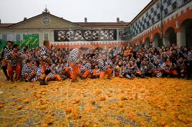 In Italy in the city of Ivrea, battle of oranges is celebrated when people throw oranges on each other. The core celebration is based on a locally famous Battle of the Oranges that involves some thousands of towns people, divided into nine combat teams, who throw oranges at each other – with considerable violence – during the traditional carnival days. These are Sunday, Monday and Tuesday. The legend is that it commemorates the city’s defiance against the city’s tyrant.