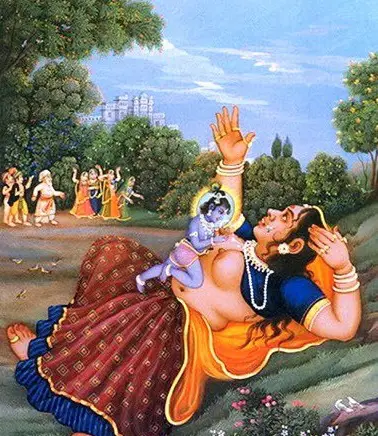 As her death approached, she regained her real, ogress appearance. All the men and women were frightened when they saw the huge, formidable body of ogress. But when they saw Krishna playing nearby, their fear gone and with joy they lifted the baby and soothed him.