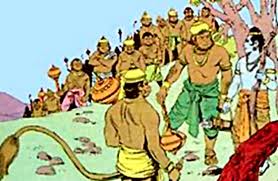 Rama appoints commanders for performing various tasks once they decided to attack Lanka. Nila was asked to attack from the east. His task was to attack Prahasta. At the south, Vali’s strong son Angad was entrusted to oppose Mahaparshva and Mahodara. Hanuman to enter from the western gate. Rama decided than he alongwith Laxman will lead the aggression from northern gate. In the centre, he appointed Jambavant and Vibheeshana to take care of the army.