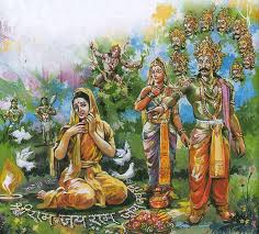Ravana informs Sia that her husband along with his army had been killed in battle, he produces before her Rama’s head along with bow and arrows created with Vidyujjuha’s conjuring trick. Thus, Ravana deceives Sita about the death of Rama. Sita was shocked, fell unconscious at the sight of Ramas head and bow.