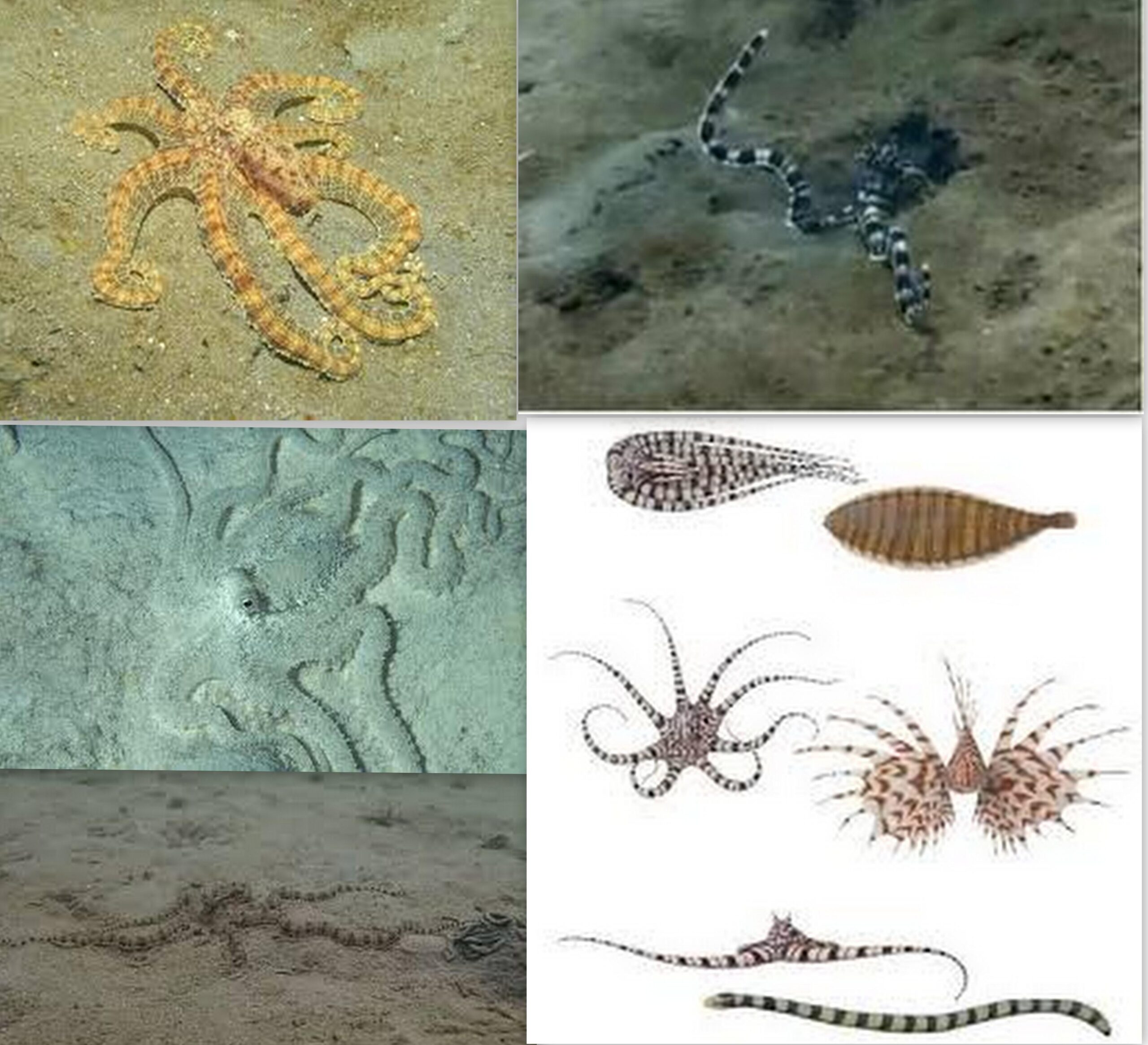 As the name suggest this is an expert to mimic other creatures. Normally it has brown and white stripes or spots. This octopus can contour its body and change its colour and also mimic the likeness and movements of more than fifteen different species including sea snakes, lionfish, flatfish, brittle stars, giant crab, sea shells, stingrays, jellyfish, sea anemones, and martis shrimps. Depending upon the predator it can decide which animal to impersonate, for example if it is attacked by a damselfish then octopus impersonate as a sea snake, (damselfish’s predator) by burying six of its arms and waving other two arms in opposite direction, and changing colour to black and yellow. Really a champion of disguise.